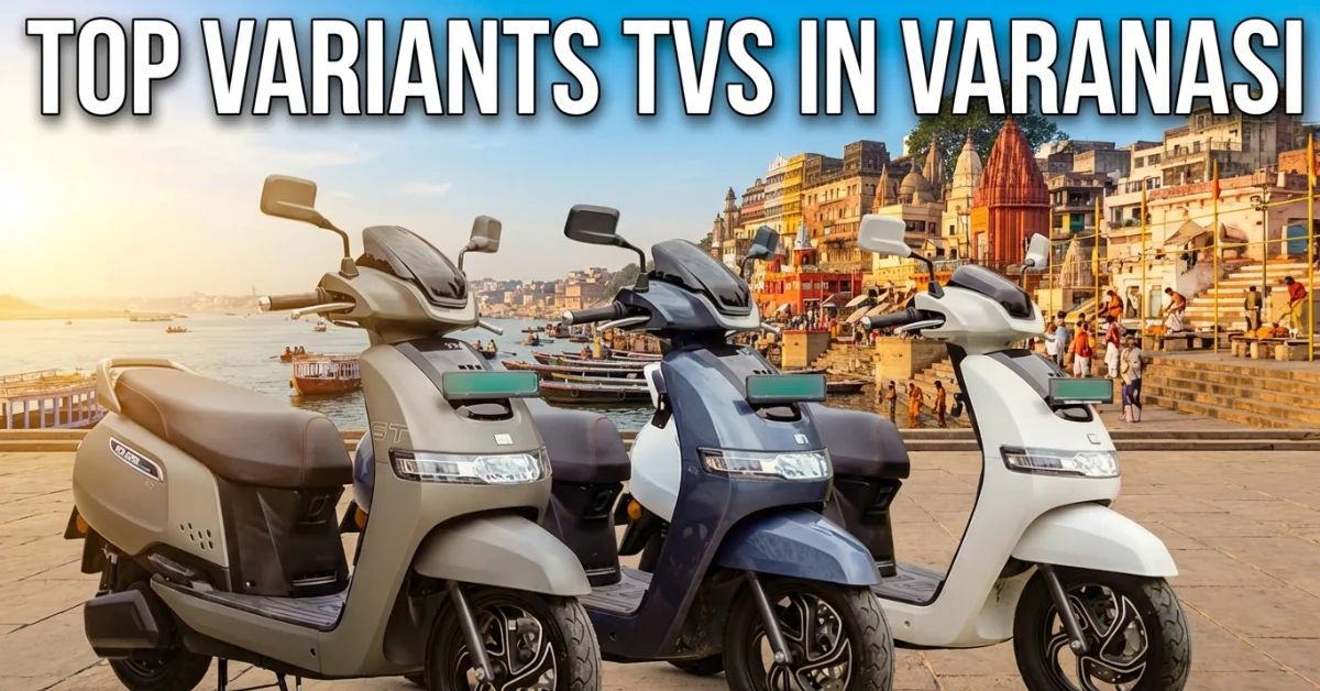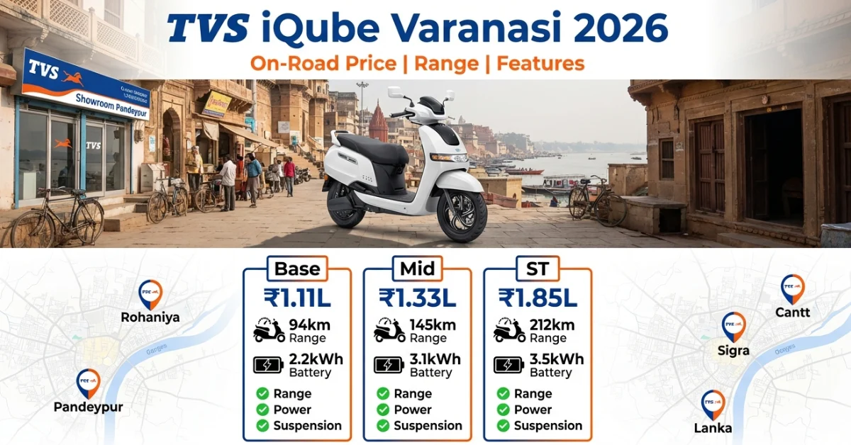 TVS Electric Scooter Price in Varanasi : अगर आप TVS iQube वाराणसी में खरीदने की सोच रहे हैं, तो यह एक किफायती और भरोसेमंद फैमिली इलेक्ट्रिक स्कूटर है जिसकी कीमत लगभग 1.11 लाख से 1.85 लाख तक है, यूपी सरकार की सब्सिडी और रोड टै्स छूट का लाभ मिलता है, EMI करीब 2500 रुपये से शुरू होती है, असली रेंज ट्रैफिक में लगभग 150–180 किमी मिलती है, यह 4–5 घंटे में चार्ज हो जाता है और कंपनी 3 साल या 50,000 किमी की वारंटी देती है।